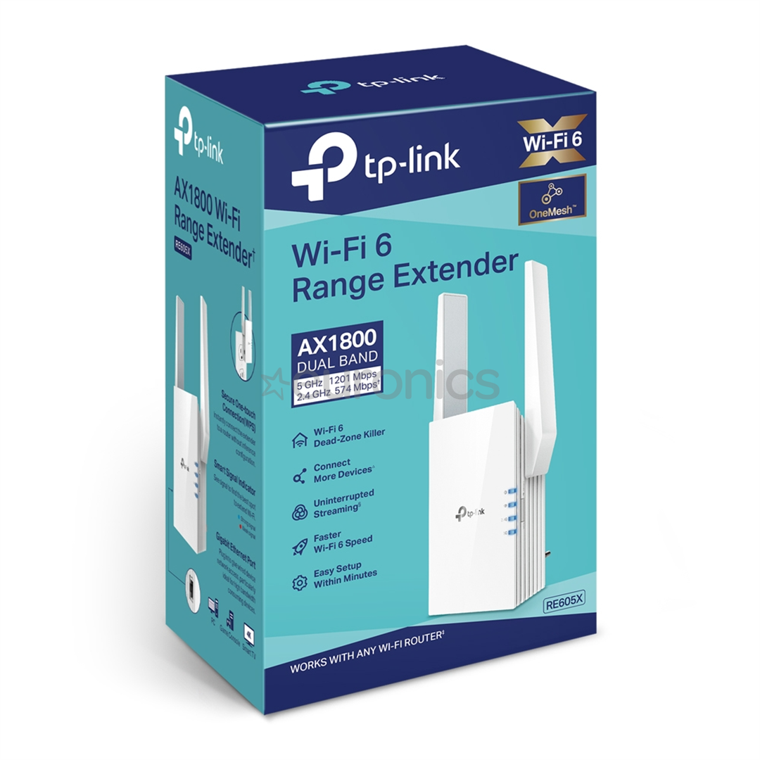 TP-Link RE605X is an AX1800 Wi-Fi range extender that utilizes the latest Wi-Fi 6 technology, providing faster speeds and greater capacity. It connects to a TP-Link OneMesh™ router to create seamless whole-home coverage.