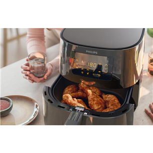 Designed for everyday cooking • XL Size. For the whole family • Touch screen with 7 presets • Keep warm function • Fry. Bake. Grill. Roast. And even reheat • Easy to use and clean • Automatic shut-off • Cool wall exterior • Dishwasher safe • On/off switch • Ready signal • Temperature control • Power-on light • Quickclean • LED display • Patented Rapid Air • Time control
