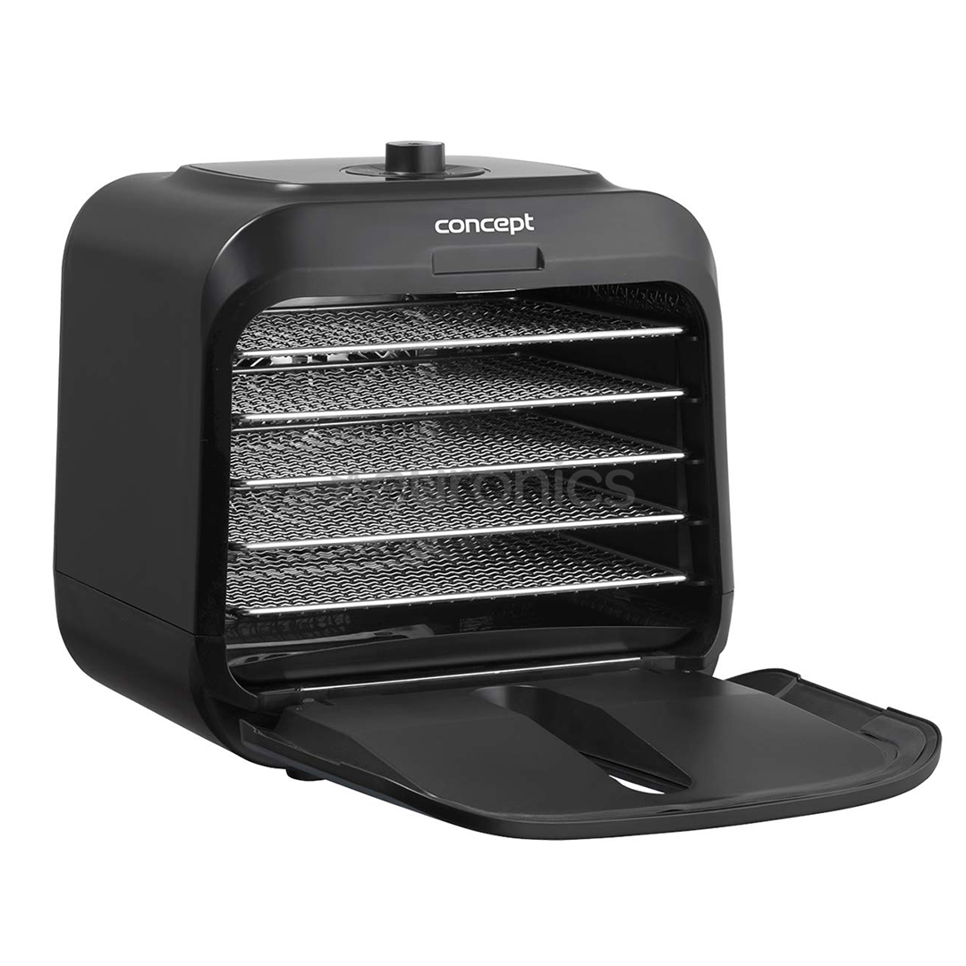 Accessories include a drip tray and 5 stainless steel trays that are dishwasher safe. The main advantage of stainless steel is its higher damage resistance. One of the other benefits is that it heats up quickly and speeds up the drying process.