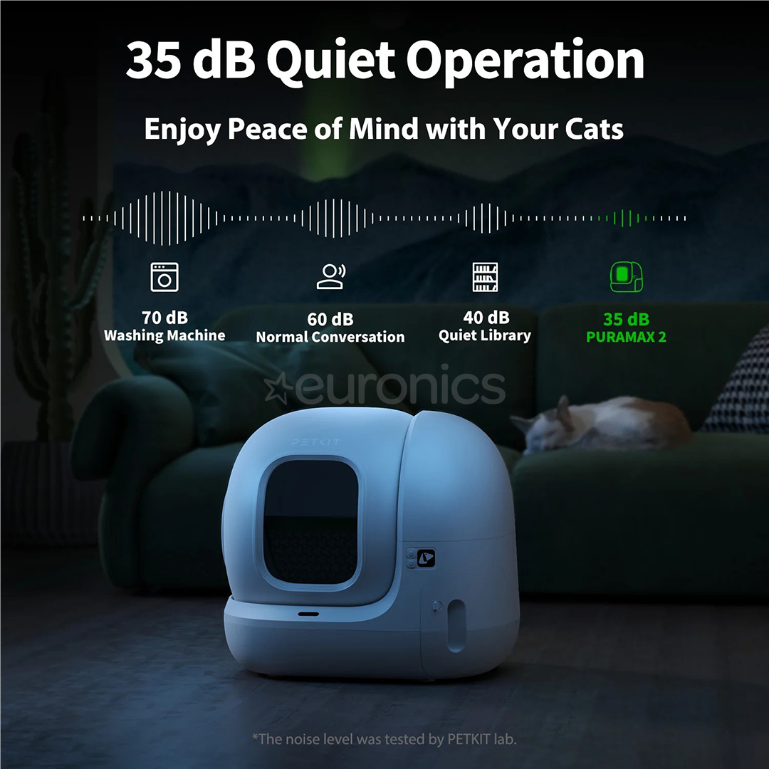 PuraMax2 kassiliivakast tuvastab automaatselt kassid nende kaalu alusel. Iga kassi kaal ja tualetikülastuste andmed salvestatakse PETKITi rakendusse. Madal künnis väikeste käppade jaoks ja avar sissepääs suurematele kassidele – PURAMAX 2 sobib erinevas suuruses ja kaaluga kassidele.