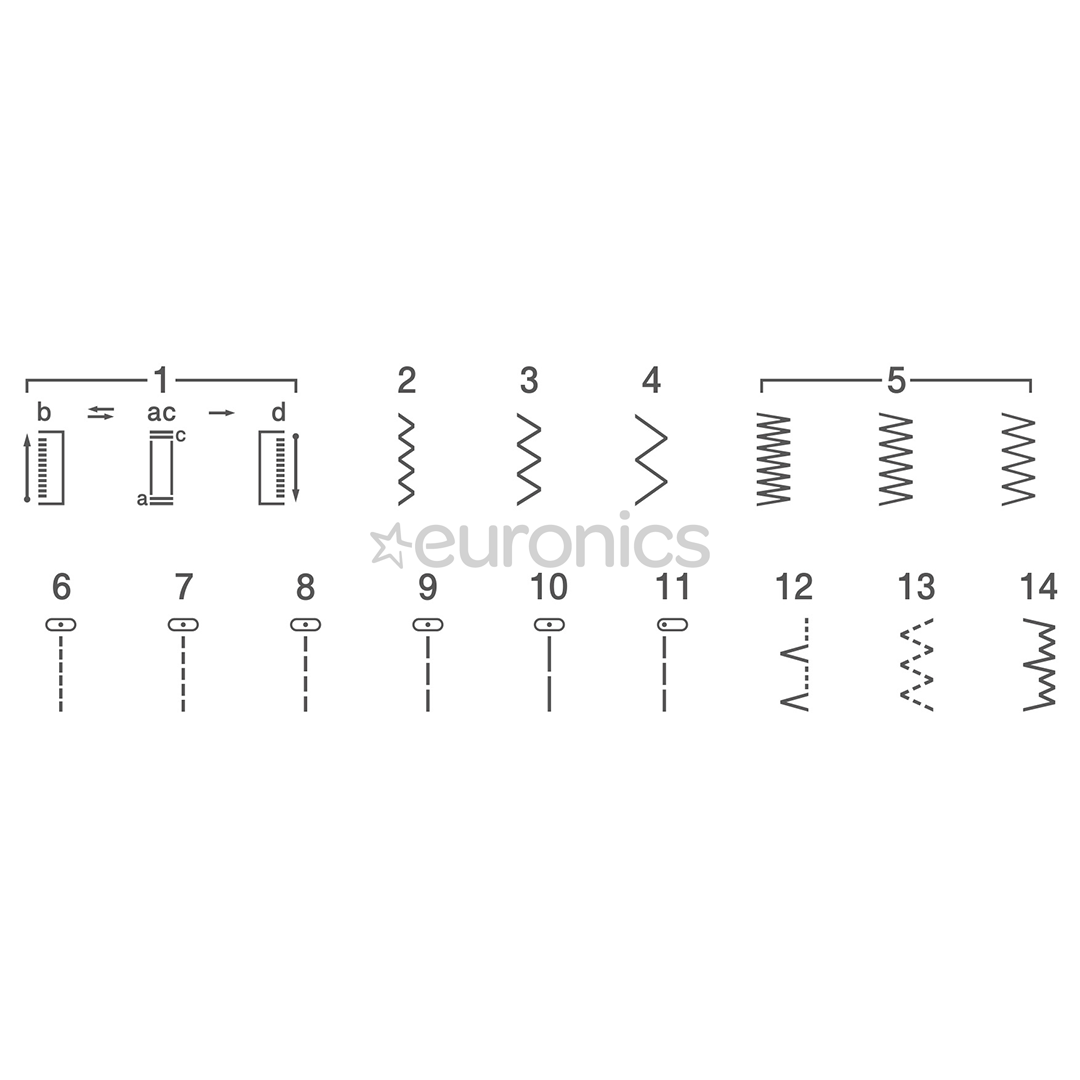 14. õmblusoperatsiooni hulgast leiate lisaks joon- ja sik-sakõmblustele 4-etapilise nööpaugu, peitõmblused ning kolme-sammu-sik-sakõmbluse.