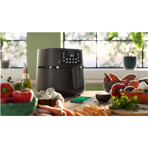 Philips Airfryer seeria 5000 XXL Connected on teie igapäevane toiduvalmistamise kaaslane, et probleemivabalt valmistada toitainete poolest tasakaalustatud ja suurepärase maitsega roogi kogu perele igal nädalapäeval.
